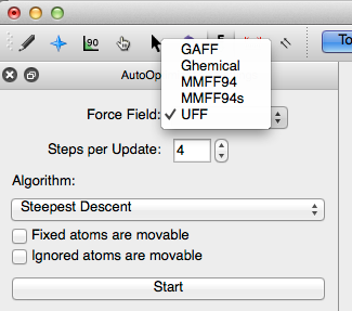 The Auto-Optimization settings provide several force field options. The default force field in Avogadro is UFF (Universal Force Field). UFF can generally reproduce the most structural features across the periodic table. However, depending on the molecule being optimized, the other force fields may be better suited to optimize the molecular parameters. The force field options are shown below. For more information on force fields refer to the optimizing geometry section of this lab manual.