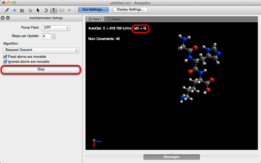Molecules will reoptimize until dE=0 or "Stop" is clicked.